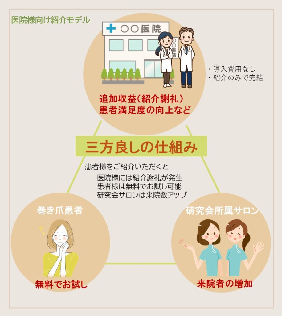 巻き爪でお悩みの患者様を協会員のサロンをご案内いただければ、その患者様は初回のフットケアを無料で対応させていただきます。